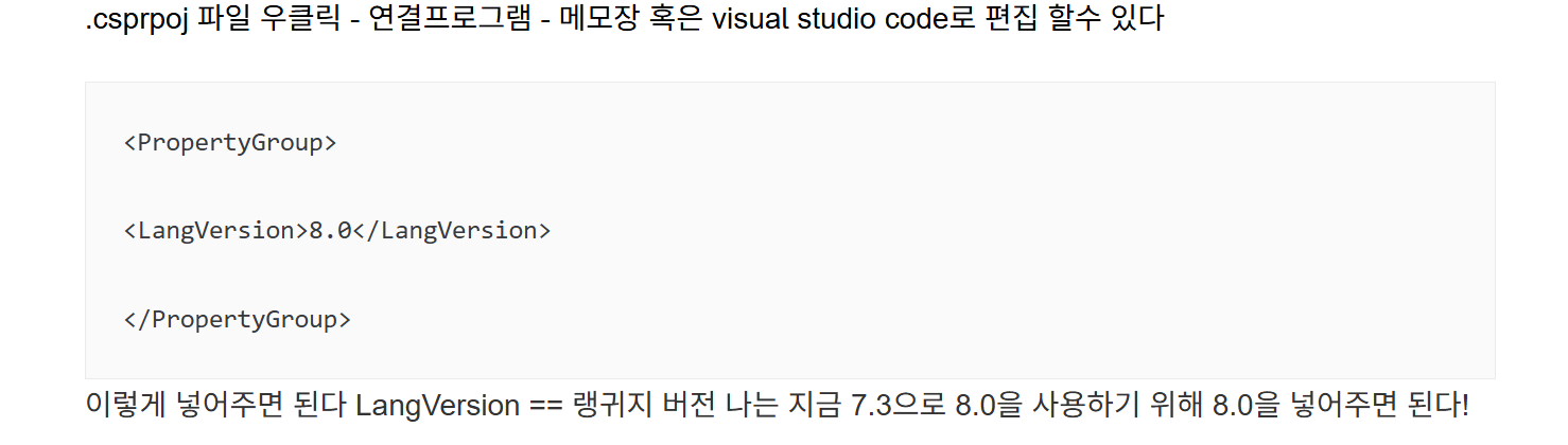 오늘 이러한 오류가 발생하였는데 빌드 버전이 문제였다 .NET Framework 는 C# 7.3 밖에 지원을 안하기 때문!! visual studio 2022 기준 이는 프로젝트 우클릭(우측 상단 파란 부분) - 속성 - 애플리케이션 에