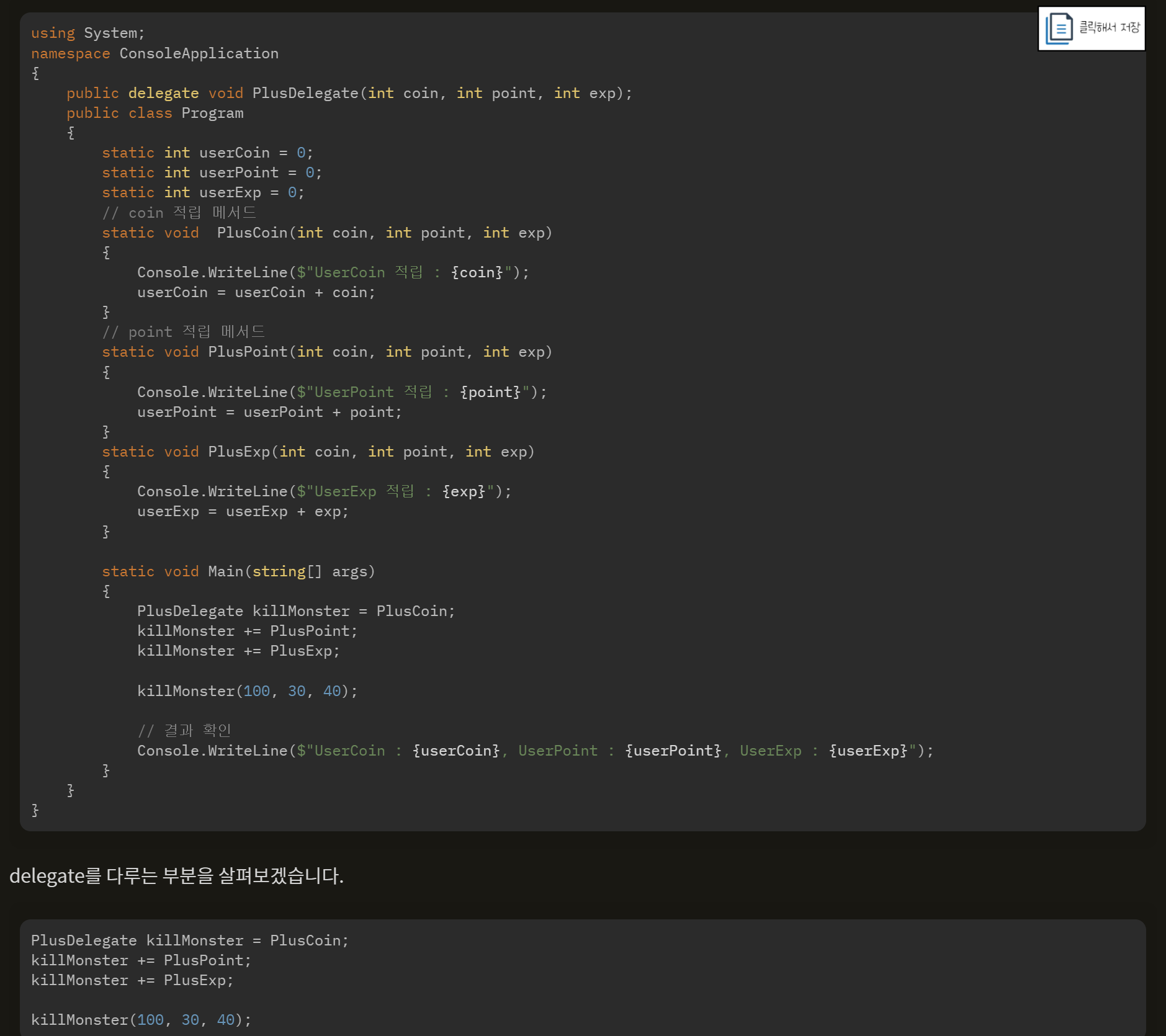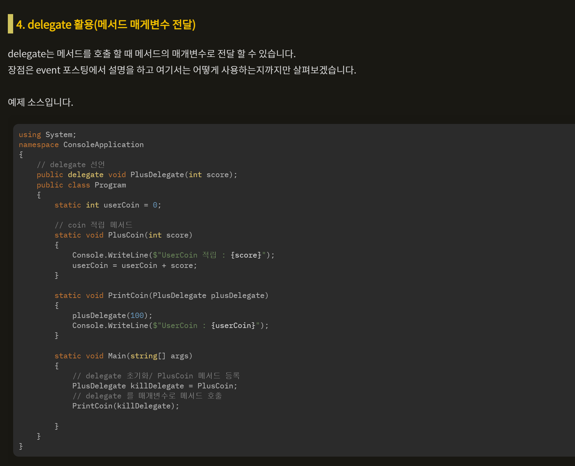 1. delegate 개요 처음 C# delegate를 접했을 때 왜 사용해야 하는지 이해하기가 힘들었습니다. 그래서 왜 사용해야 하는지에 대해 자세히 설명하겠습니다. C#에는 대리자(delegate)라는 개념이 존재합니