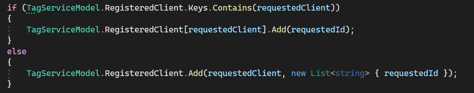 Dictionary<string, List<string>> MyDict = new Dictionary<string, List<string>>(); // 새로 추가 MyDict.Add(key, new List<string> {"value"}); // 기존 key에 value 추가 MyDict[key]/Add("value");