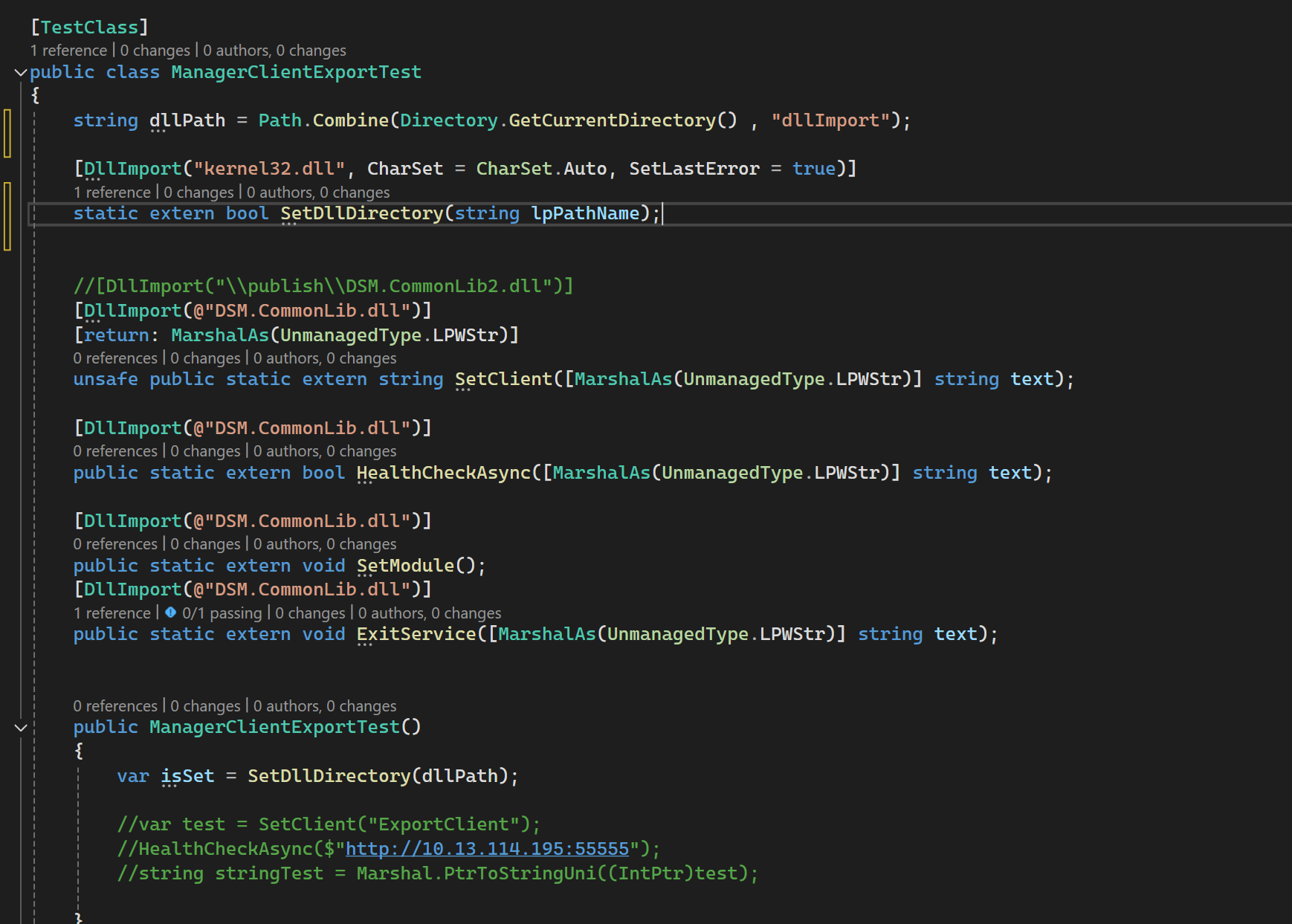 string dllPath = Path.Combine(Directory.GetCurrentDirectory() , "dllImport"); [DllImport("kernel32.dll", CharSet = CharSet.Auto, SetLastError = true)] static extern bool SetDllDirectory(string lpPathName); public ManagerClientExportTest() { var isSet = SetDllDirectory(dllPath); }