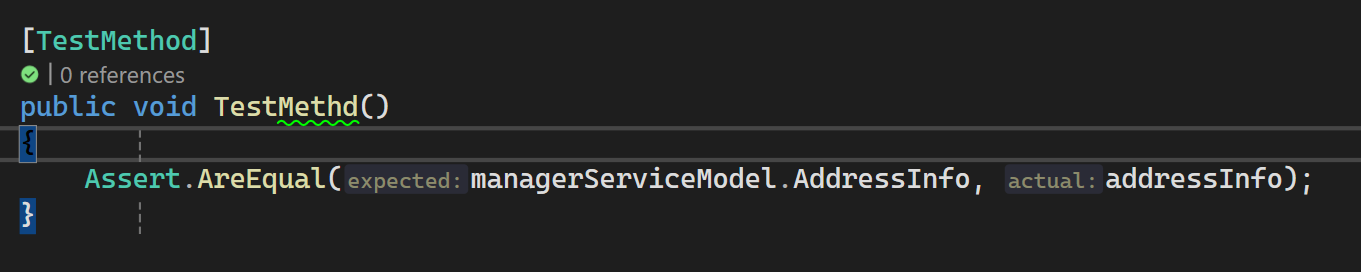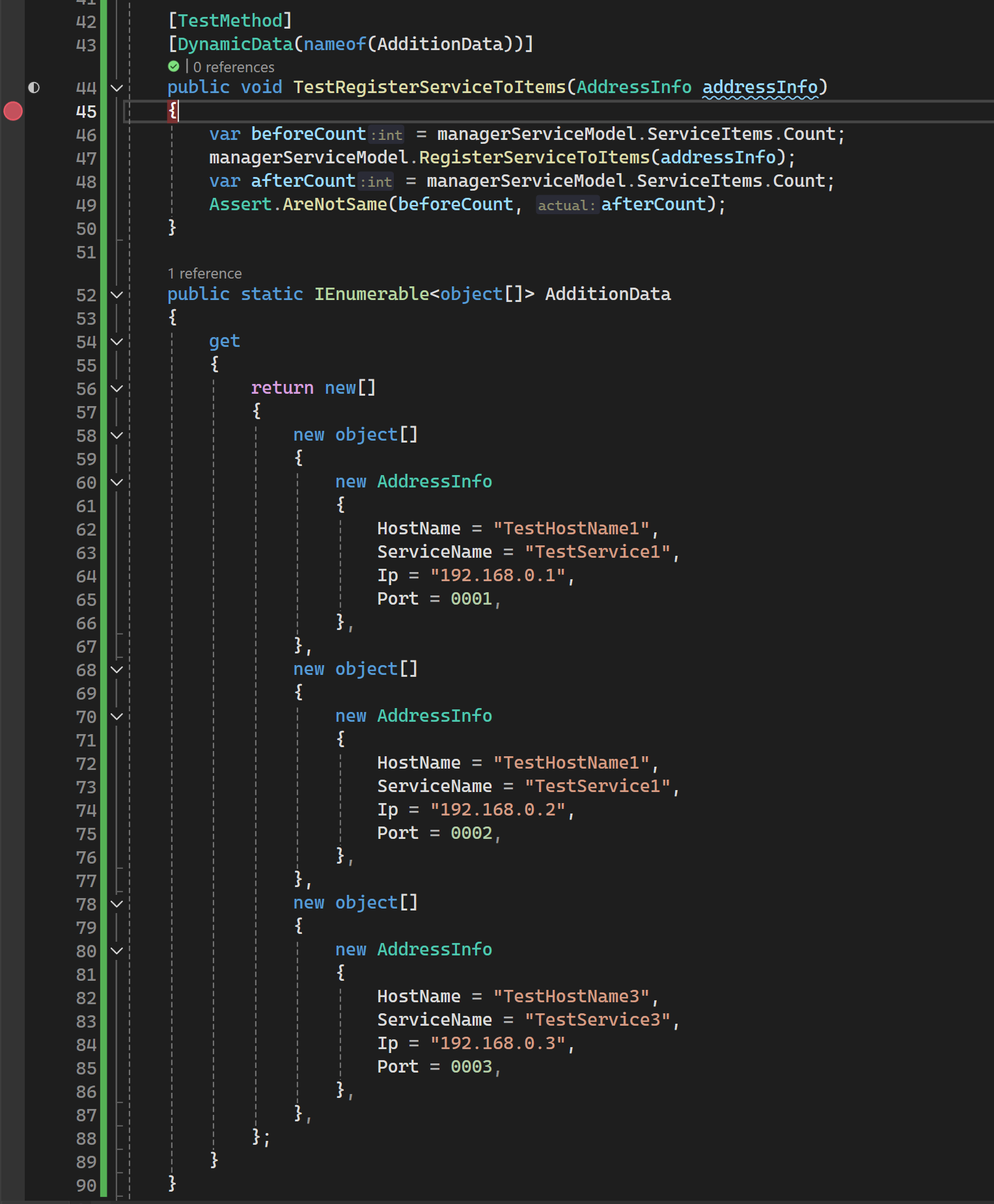 [TestMethod] [DynamicData(nameof(AdditionData))] public void TestRegisterServiceToItems(AddressInfo addressInfo) { var beforeCount = managerServiceModel.ServiceItems.Count; managerServiceModel.RegisterServiceToItems(addressInfo); var afterCount = managerServiceModel.ServiceItems.Count; Assert.AreNotSame(beforeCount, afterCount); } public static IEnumerable<object[]> AdditionData { get { return new[] { new object[] { new AddressInfo { HostName = "TestHostName1", ServiceName = "TestService1", Ip = "192.168.0.1", Port = 0001, }, }, new object[] { new AddressInfo { HostName = "TestHostName1", ServiceName = "TestService1", Ip = "192.168.0.2", Port = 0002, }, }, new object[] { new AddressInfo { HostName = "TestHostName3", ServiceName = "TestService3", Ip = "192.168.0.3", Port = 0003, }, }, }; } }