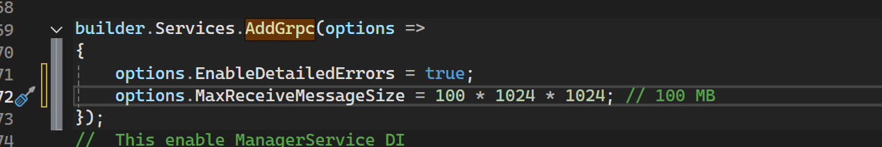 public void ConfigureServices(IServiceCollection services) { services.AddGrpc(options => { options.EnableDetailedErrors = true; options.MaxReceiveMessageSize = 2 * 1024 * 1024; // 2 MB options.MaxSendMessageSize = 5 * 1024 * 1024; // 5 MB }); }