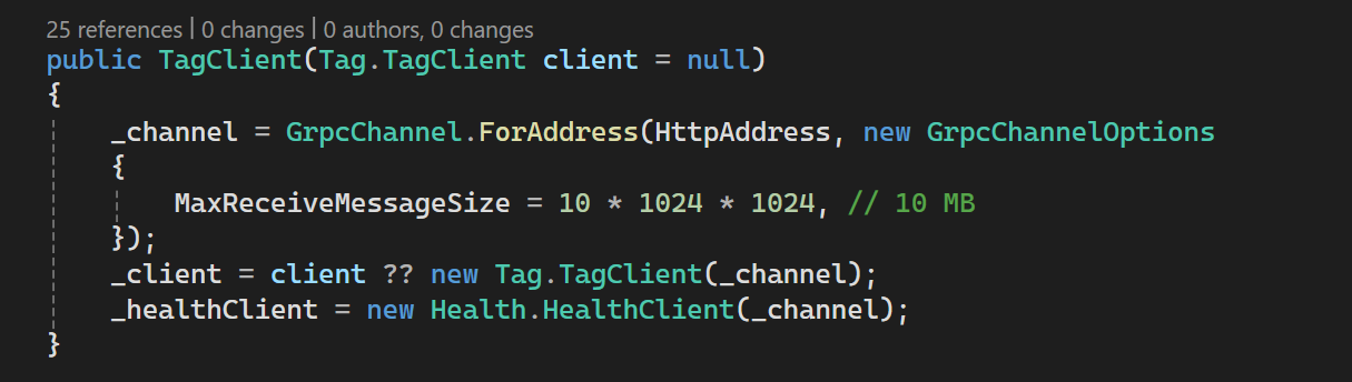 static async Task Main(string[] args) { var channel = GrpcChannel.ForAddress("https://localhost:5001", new GrpcChannelOptions { MaxReceiveMessageSize = 5 * 1024 * 1024, // 5 MB MaxSendMessageSize = 2 * 1024 * 1024 // 2 MB }); var client = new Greeter.GreeterClient(channel); var reply = await client.SayHelloAsync( new HelloRequest { Name = "GreeterClient" }); Console.WriteLine("Greeting: " + reply.Message); }