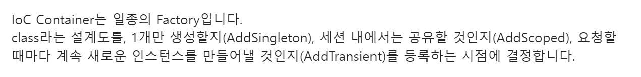 Register 할거 있으면 먼저 다 하고 Resolve 진행. (=> Resolve 는 IServiceProvider의 기능이라고 보면 됨.)