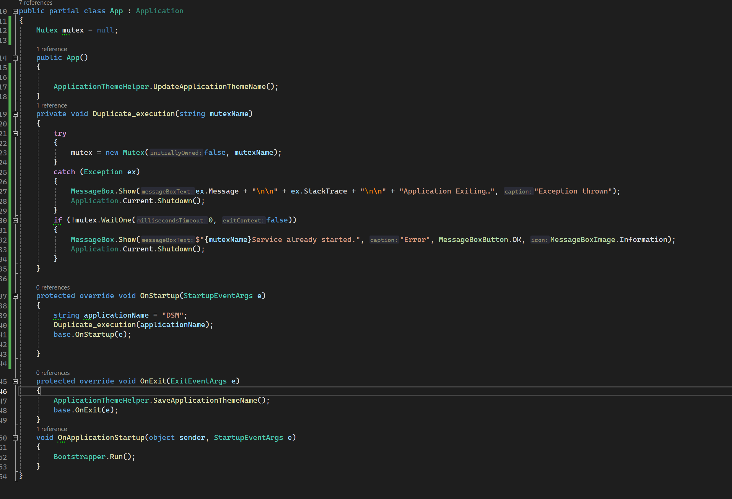 Mutex mutex = null; private void Duplicate_execution(string mutexName) { try { mutex = new Mutex(false, mutexName); } catch (Exception ex) { MessageBox.Show(ex.Message + "\n\n" + ex.StackTrace + "\n\n" + "Application Exiting…", "Exception thrown"); Application.Current.Shutdown(); } if (!mutex.WaitOne(0, false)) { MessageBox.Show($"{mutexName}Service already started.", "Error", MessageBoxButton.OK, MessageBoxImage.Information); Application.Current.Shutdown(); } } protected override void OnStartup(StartupEventArgs e) { string applicationName = "DSM"; Duplicate_execution(applicationName); base.OnStartup(e); }