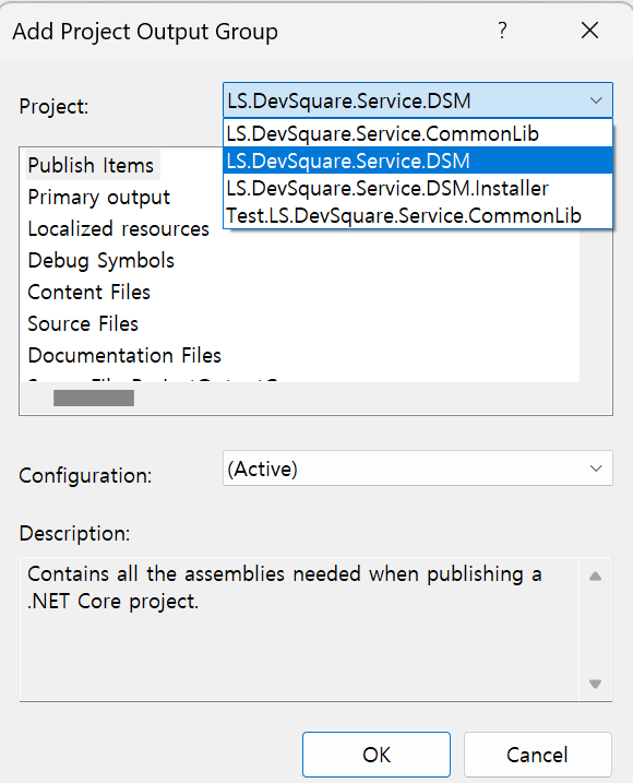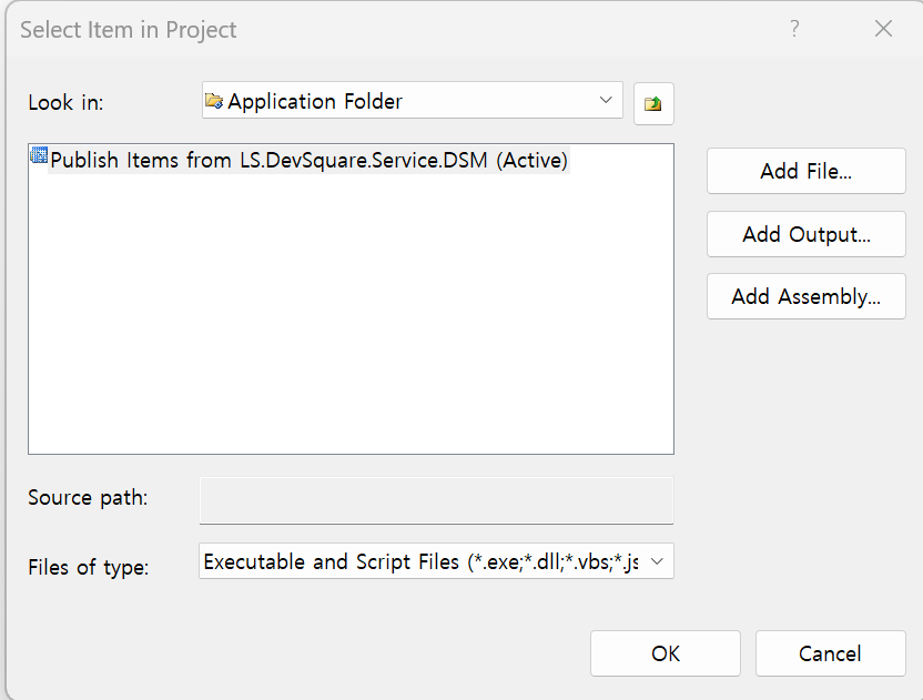 Project 선택 및 .exe items 선택 ( publish 폴더에 있는거, output폴더에 있는거)